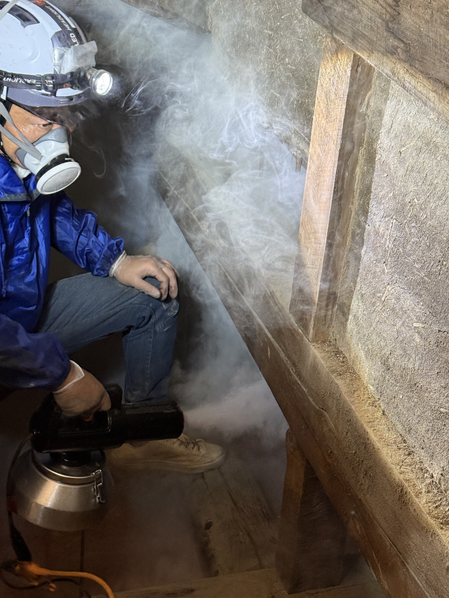 ①コウモリの追い出し(専用忌避剤+スモーク処理)
